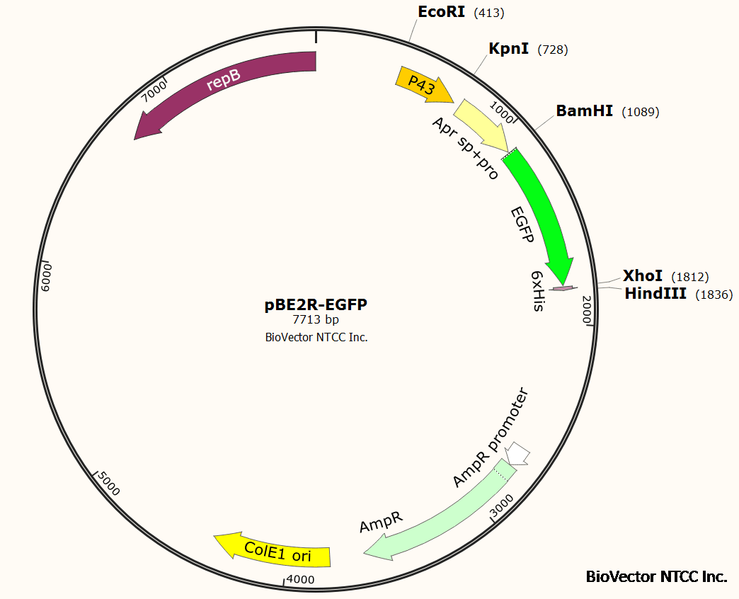 pBE2R-EGFP枯草芽孢杆菌组成型荧光表达载体,带有P43组成型表达启动子,eGFP绿色荧光报告基因,6xHis标签,Amp抗性。