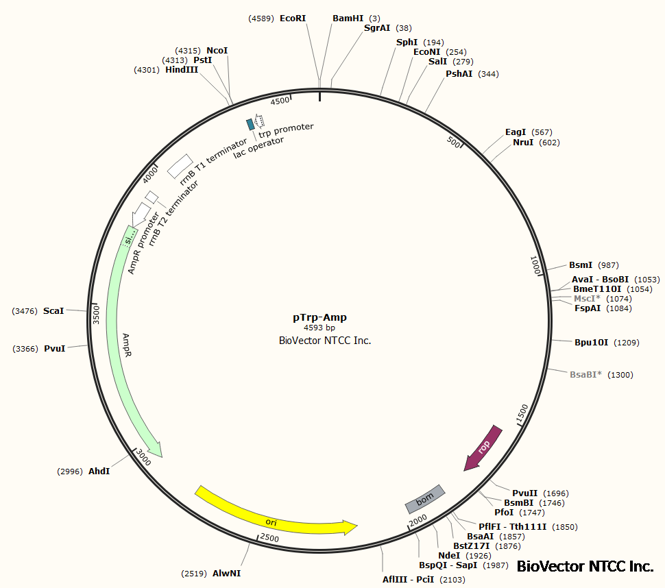 pTrp-Amp原核表达载体,带有Trp启动子,Amp抗性。BioVector NTCC质粒载体菌种细胞蛋白抗体基因保藏中心