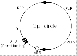 A cartoon of the yeast 2 u circle showing the ARS, the FLP gene, the three genes which encode proteins required for regulation of FLP expression (REP2, REP1, and D), and a set of small direct repeats (called "STB") required for partitioning into daughter cells during mitosis and meiosis.