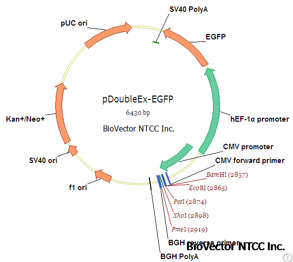 - 货 号:pDoubleEx-EGFP(双表达框载体,hEF1αp后已插入EGFP,CMVp后可插入目的基因)