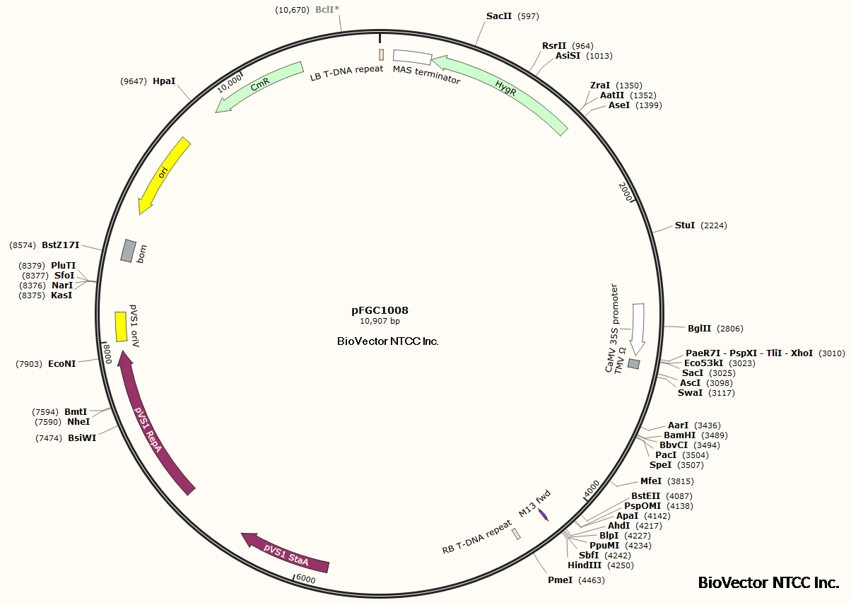 pFGC1008植物基因沉默干扰载体质粒。35S启动子,Cm氯霉素抗性,潮霉素hygromycin植物筛选标记。
