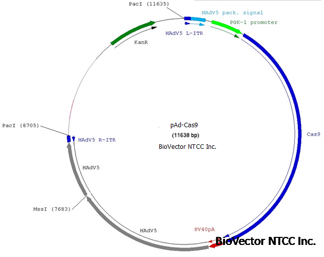 pAd-Cas9腺病毒CRISPR-Cas9基因编辑载体,PGK-1启动子,表达人源密码子优化的SpCas9基因,Kan抗性,Neo-G418真核细胞筛选标记。[Supplier来源] http://www.biovector.net