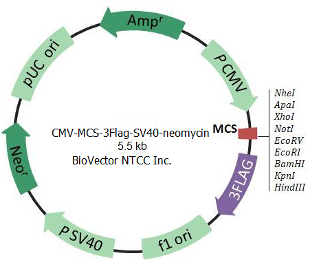 Biovector508125 | CMV-MCS-3Flag-SV40-neomycin | CMV-MCS-3Flag-SV40-neomycin,AmpR.300uL,in E.coli. Storage:4℃ |