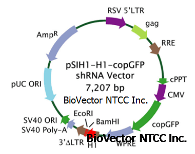 pSIH1-H1-CopGFP慢病毒shRNA荧光表达载体基因沉默载体,H1启动子+shRNA序列,CMV启动子+copGFP荧光报告基因,Amp抗性。基于HIV的慢病毒载体。