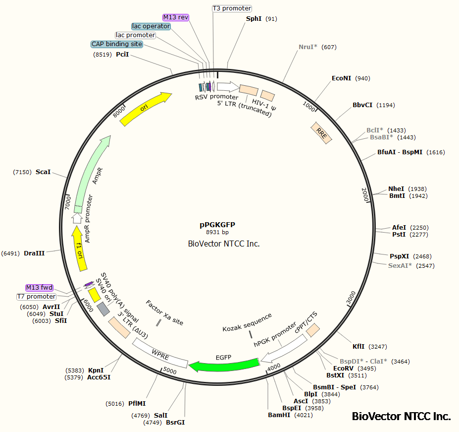 pPGKGFP慢病毒荧光表达载体,PGK启动子,EGFP绿色荧光报告基因,Amp抗性。