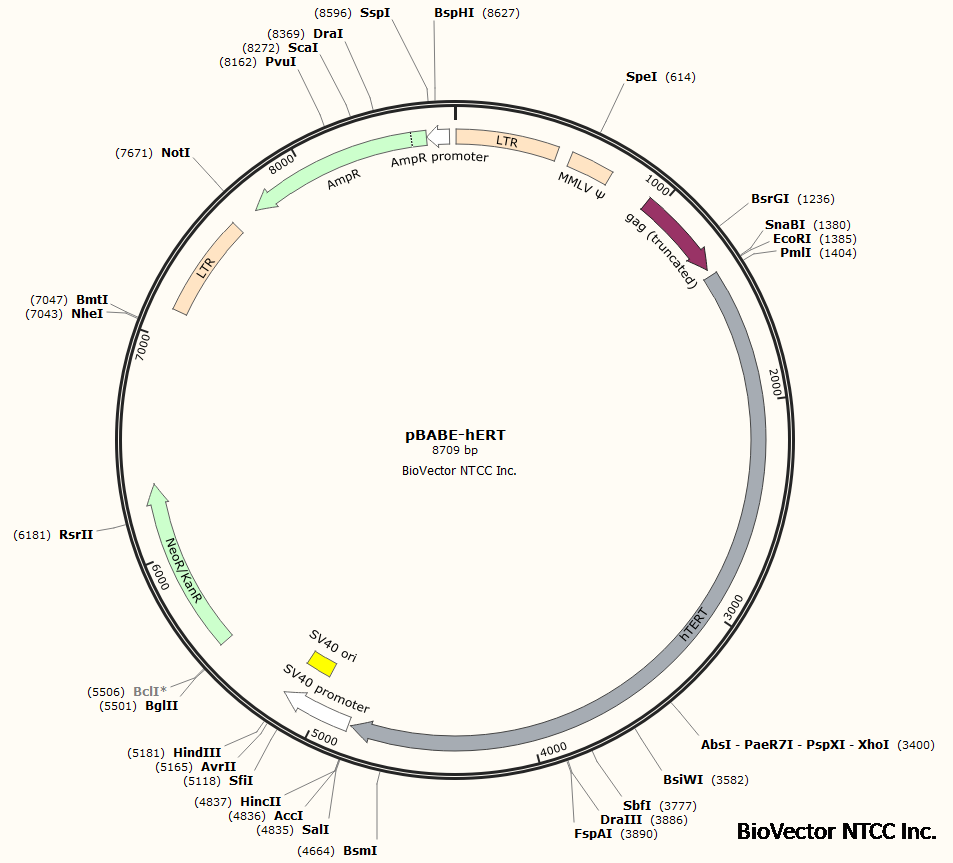pBABE-hTERT细胞永生化载体逆病毒表达质粒,Amp抗性,Neo-G418细胞筛选标记。