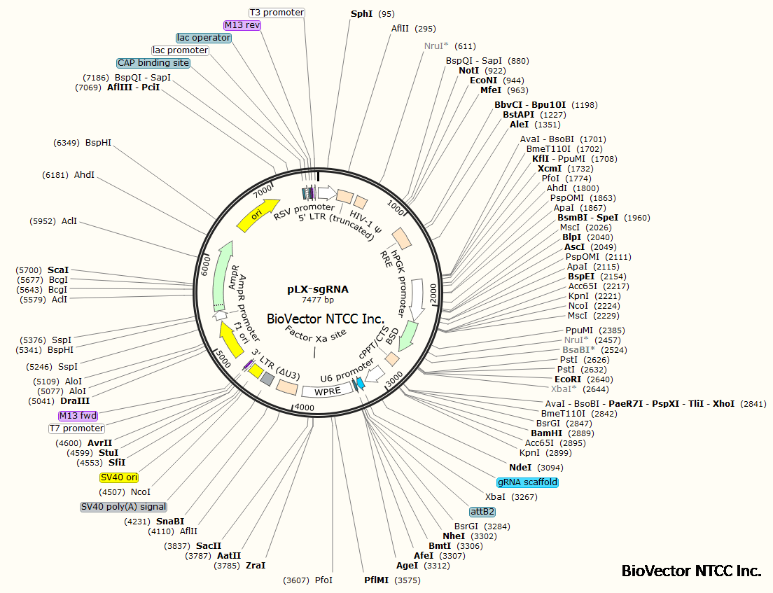 pLX-sgRNA载体CRISPR-Cas9慢病毒质粒表达AAVS1靶向sgRNA序列,Lentiviral expression of AAVS1-targeting sgRNA; insert can be replaced with custom sgRNA.
