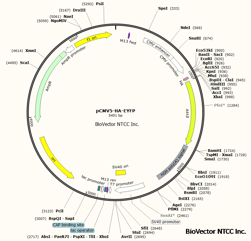 pCMV5-HA-EYFP真核过表达黄色荧光标签载体带HA标签-BioVector NTCC质粒载体菌种细胞基因保藏中心