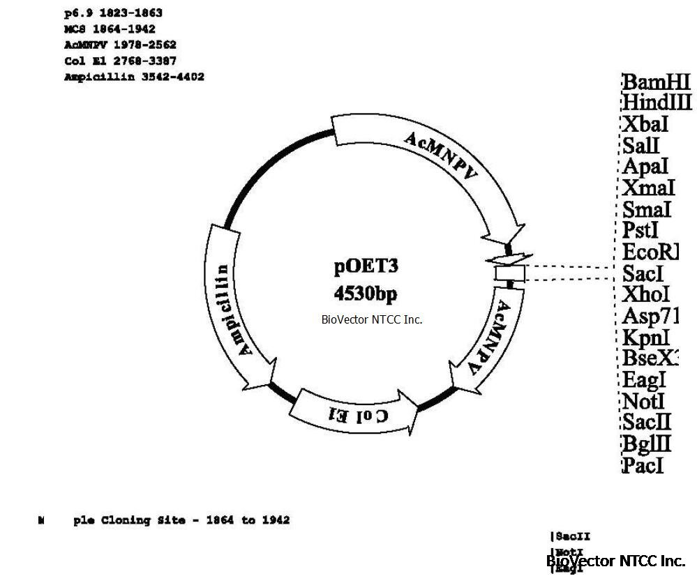 pOET3 is a baculovirus transfer vector designed for high level expression of foreign genes under the late AcMNPV basic (p6.9) promoter. Using this promoter will provide earlier expression compared to the polyhedrin promoter. This has been shown to be beneficial when expressing proteins which require extensive posttranslational modifications i.e. glycosylation. The vector is smaller than other available transfer vectors (4530bp) which greatly facilitate the cloning steps. It has a bacterial origin of replication and an ampicillin resistance gene for selection in E. coli. The AcMNPV sequences flanking the gene in the transfer vectors MCS allow recombination with the viral DNA to insert the expression cassette into the polyhedrin locus. The polyhedrin sequences have been replaced by a multiple cloning site containing unique restriction sites for insertion of the foreign gene in the correct orientation. pOET3 is compatible with any baculovirus system that utilizes homologous recombination in insect cells.