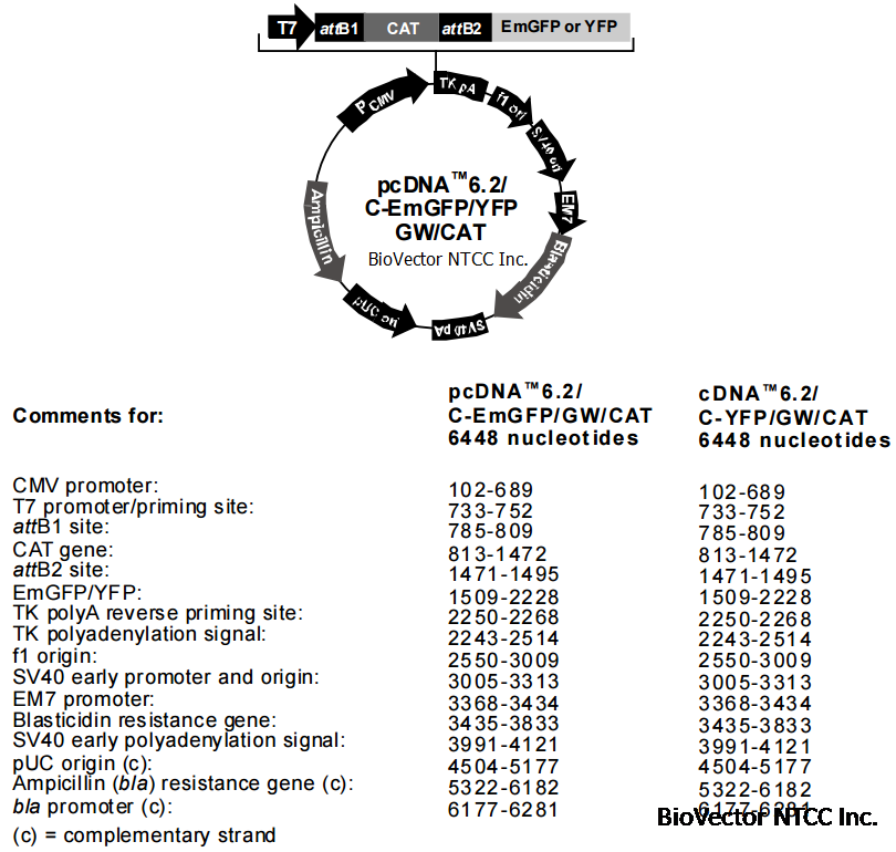pcDNA6.2/C-EmGFP/GW/CAT ,pcDNA6.2/C-YFP/GW/CAT荧光表达载体gateway载体-BioVector NTCC质粒载体菌种细胞蛋白抗体基因保藏中心
