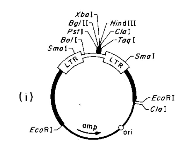 pBR322 DNA (narrow black line). The LTRs are Moloney murine leukemia virus (MoMLV) long terminal repeats (LTRs).